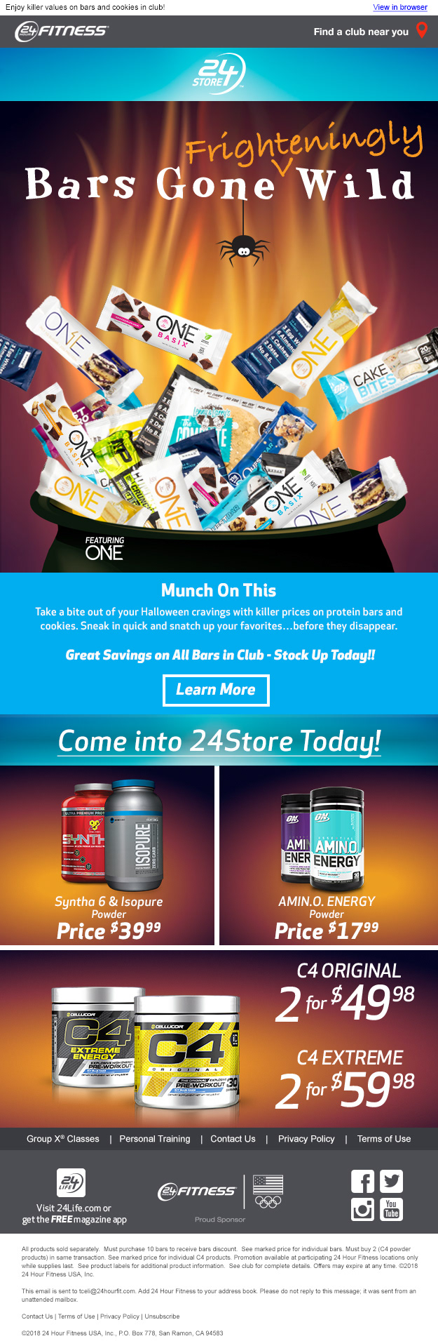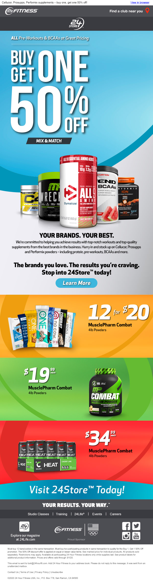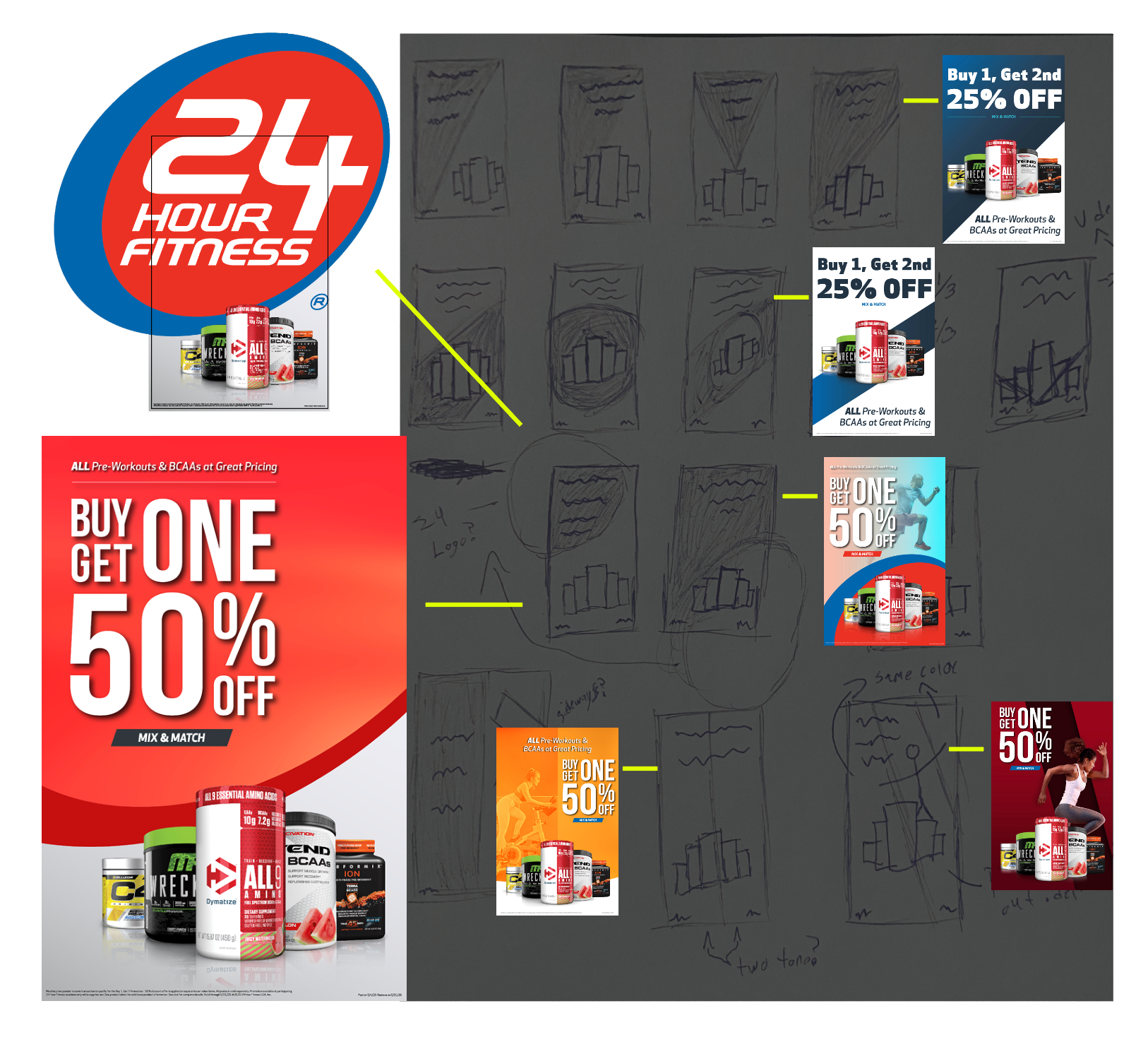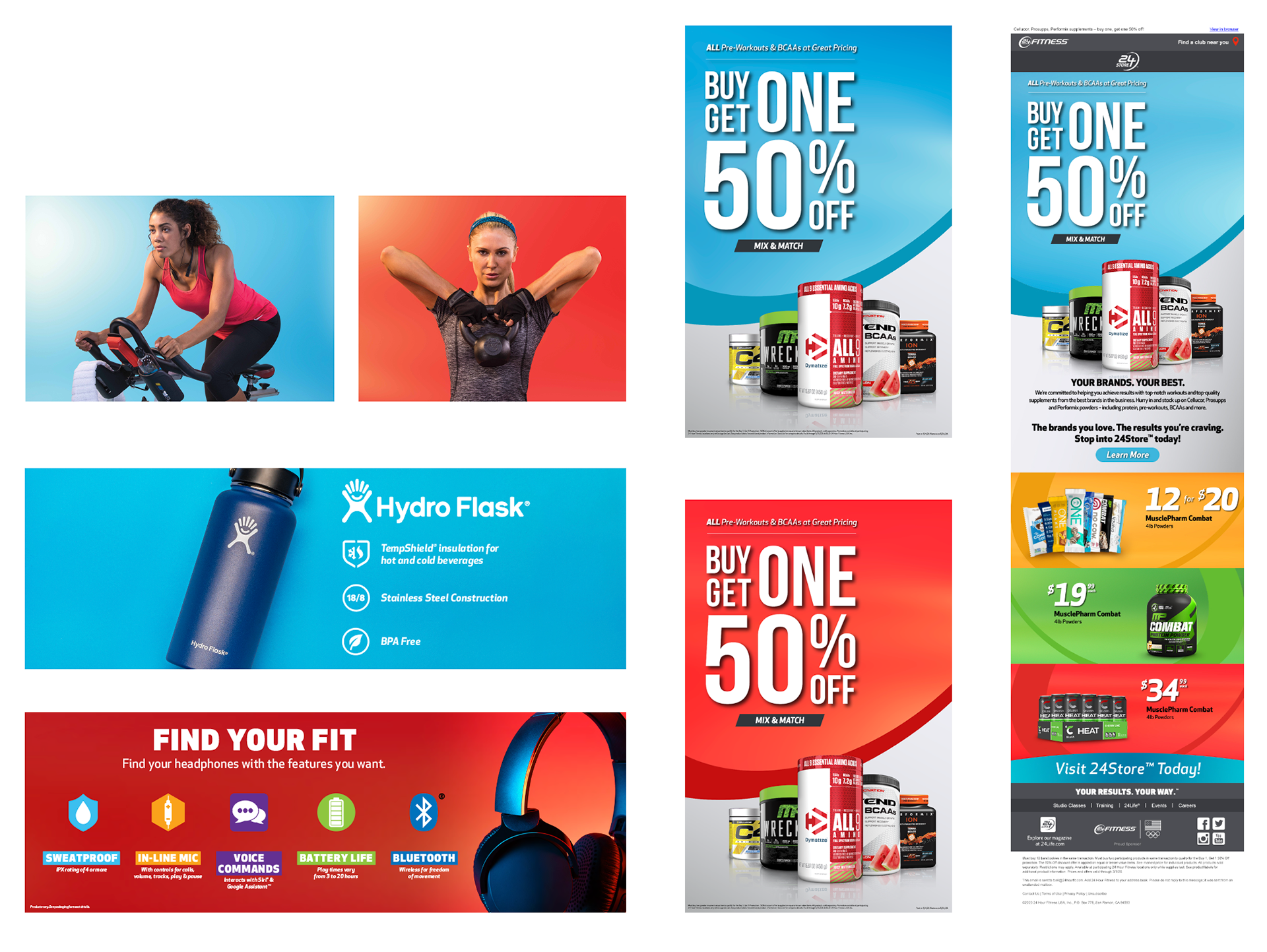 After many different ideas being brought to life, we finally decided on a unique design that would be the brand new look. It is subtle with using the 24 Hour Fitness logo as a container for the offers and has a simple clean look while connecting with the main brand and the new 24 Retail photography.