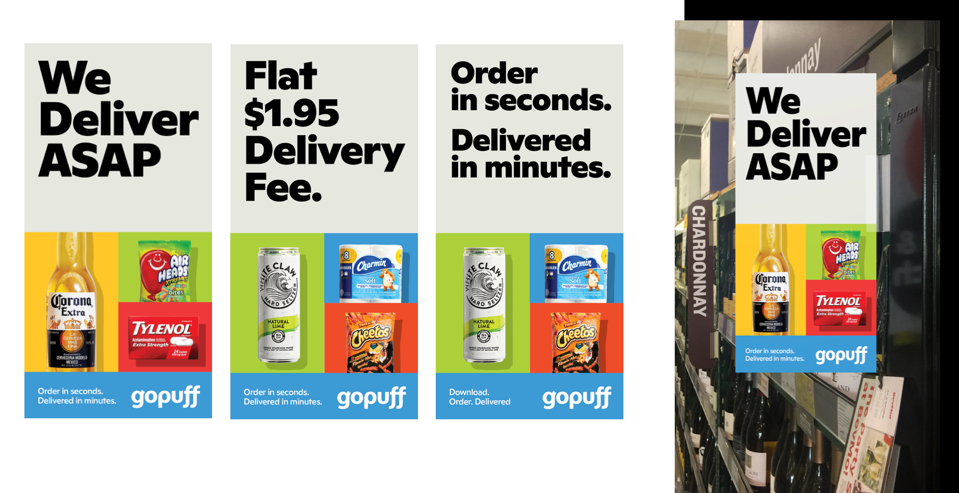 I collaborated with the team to develop creative solutions that met the project’s demands. The signs featured in my portfolio are just a few examples of the final designs created for in store display. We successfully communicated the fast, convenient, and affordable benefits of using the Gopuff app, ensuring that the messaging resonated with customers across various in store formats.