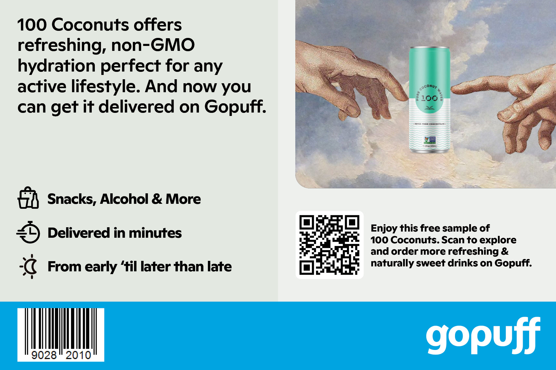 Here’s a creative postcard for a Gopuff vendor product, designed to align with Gopuff’s brand guidelines while maintaining the simple, clean aesthetic seen in store. I added my own creative touch by featuring the product emerging from a coconut on the cover, giving it a dynamic and eye catching effect.